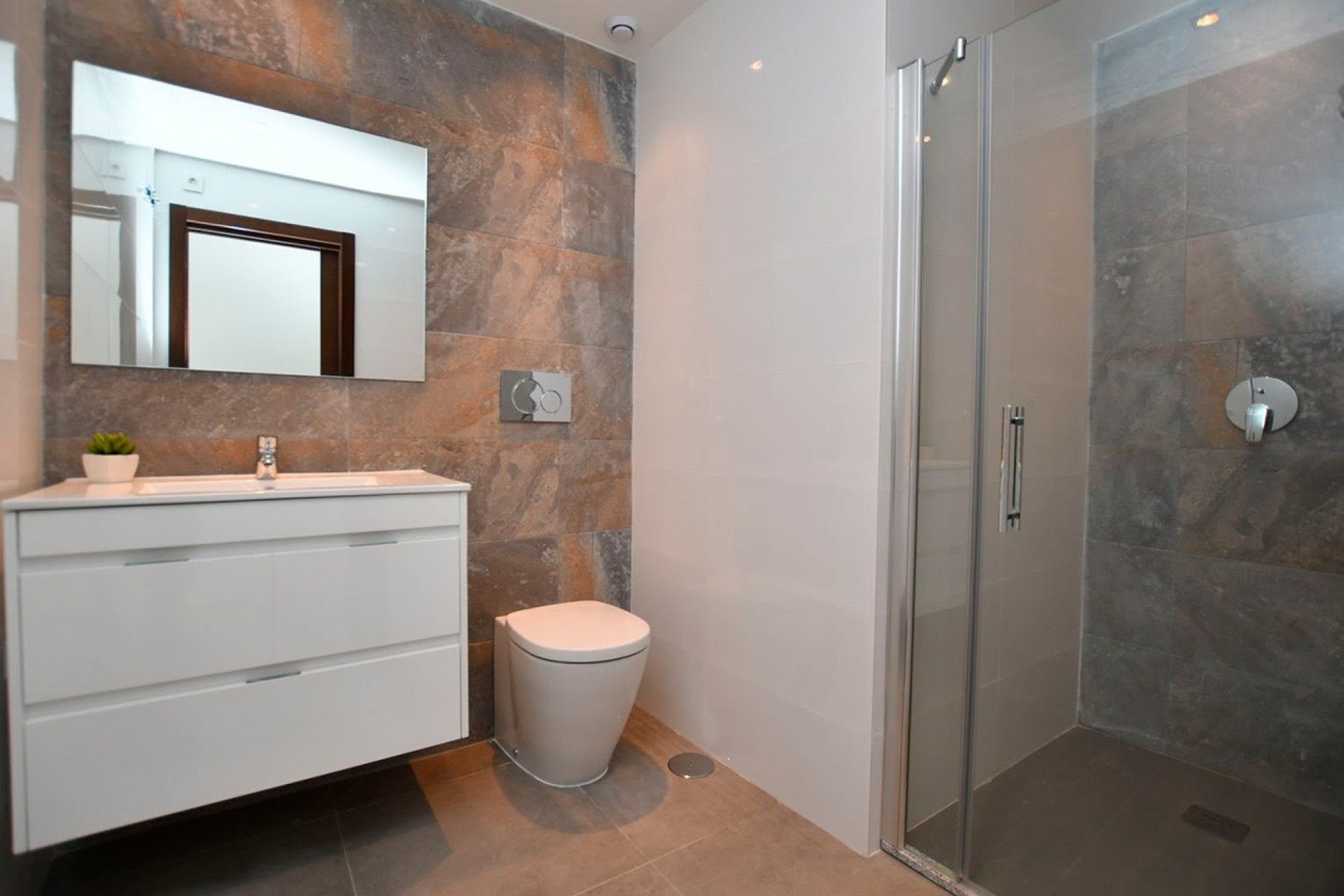 Baños con sanitarios de primeras marcas, cisterna empotrada, grifería de diseño, mueble de baño, espejo empotrado y mampara de ducha.
