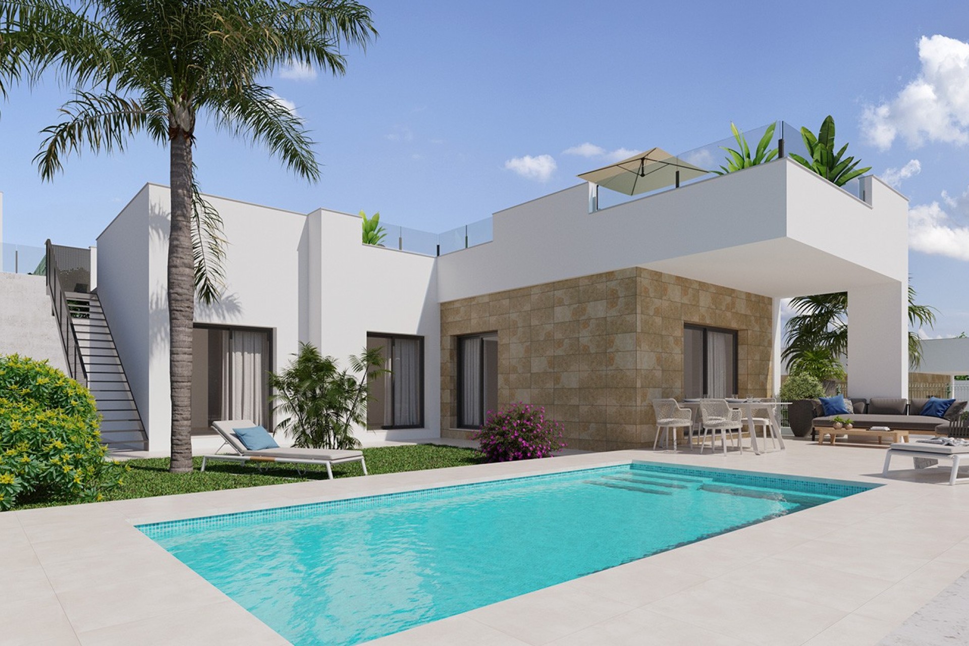 Este exclusivo desarrollo constará de 36 villas independientes, diseñadas pensando en el máximo confort y elegancia. Todas las viviendas cuentan con 3 amplios dormitorios y 3 baños completos, distribuidos en espacios abiertos que maximizan la luz natural y la conexión con el exterior. Existen dos estilos de villas disponibles: una villa distribuida en una sola planta con solárium y otra villa con dos plantas más un solárium, adaptándose así a diferentes estilos de vida y preferencias.