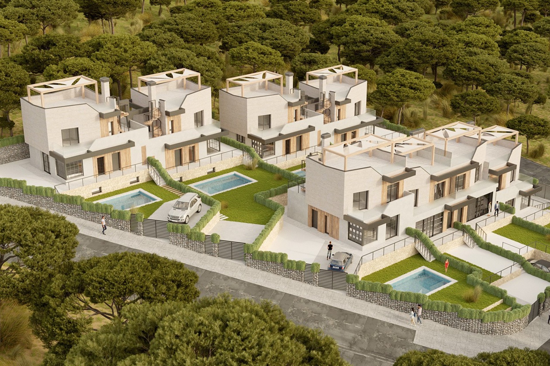 Los interiores ofrecen acabados de alta calidad y una disposición que integra el salón-comedor con las terrazas y jardines privados, creando un espacio ideal tanto para la vida diaria como para el ocio. En el exterior, cada propiedad dispone de una piscina privada rodeada de zonas ajardinadas, perfecta para disfrutar del clima mediterráneo. Además, las villas han sido diseñadas con un enfoque en la sostenibilidad y eficiencia energética, incorporando materiales de construcción modernos y sistemas respetuosos con el medio ambiente.